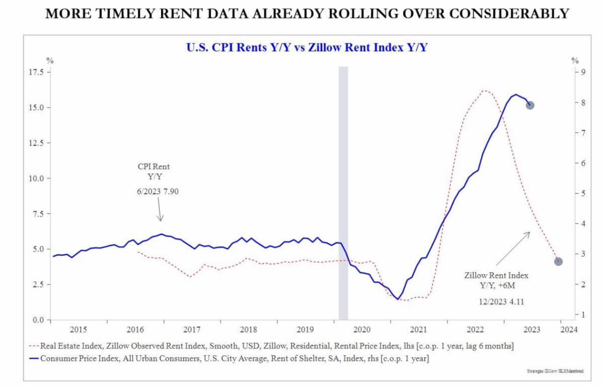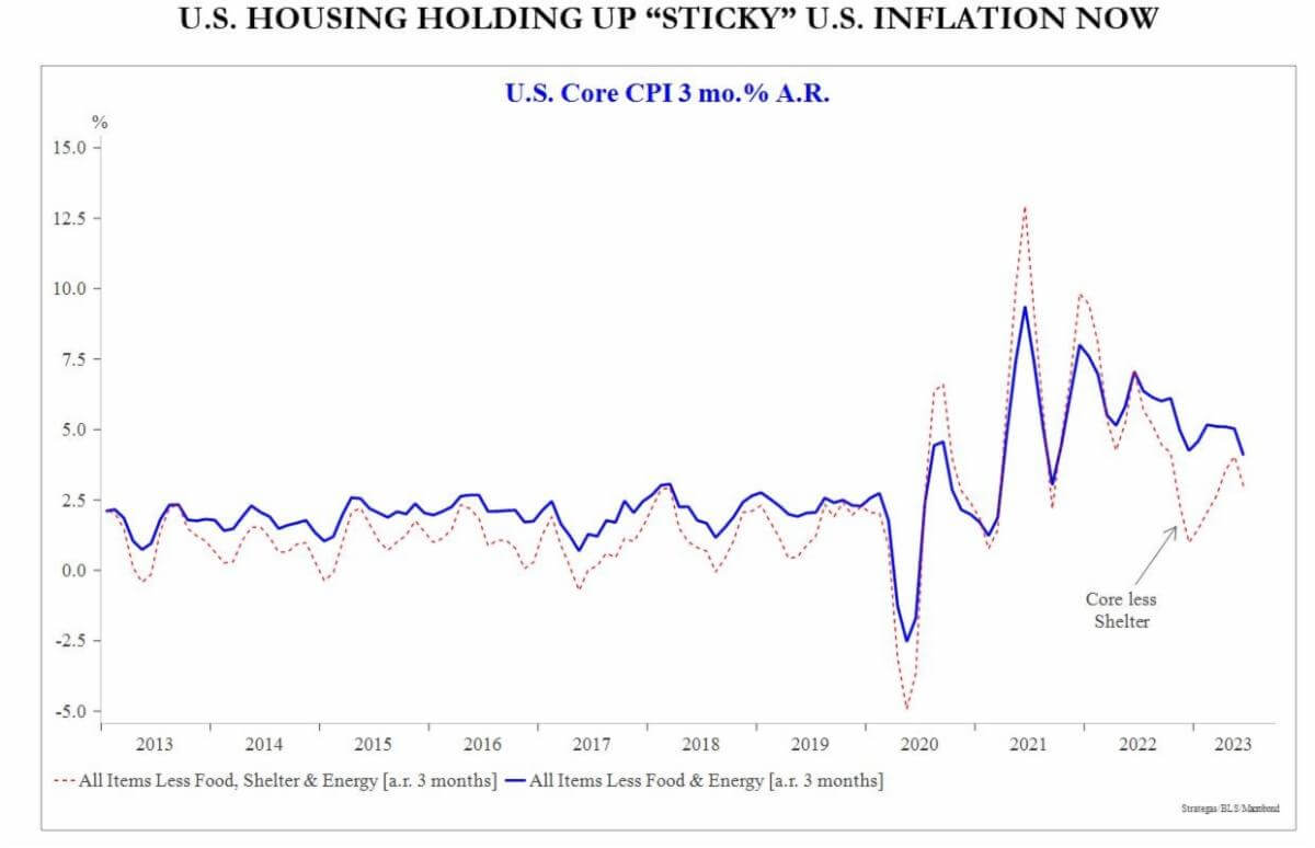 Price inflation peaked in mid-2022, though “sticky” core components matter. While cracks are appearing, the U.S. labor market does not appear to have rolled over enough to remove concerns about wage inflation yet – this still matters for CPI services inflation.